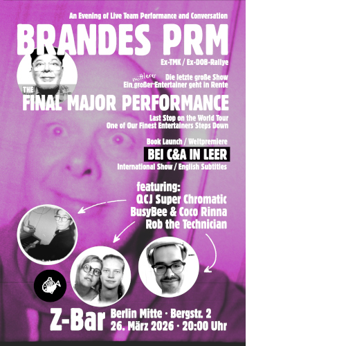 Brandes PRM: The final major performance SHOW ::: BRANDES PRM ::: An Evening of Live Team Performance and Conversation. BRANDES PRM. Ex-TMK. Ex-DOB-Rallye. Die letzte große Show. Ein mittlerer Entertainer geht in Rente. The final major…